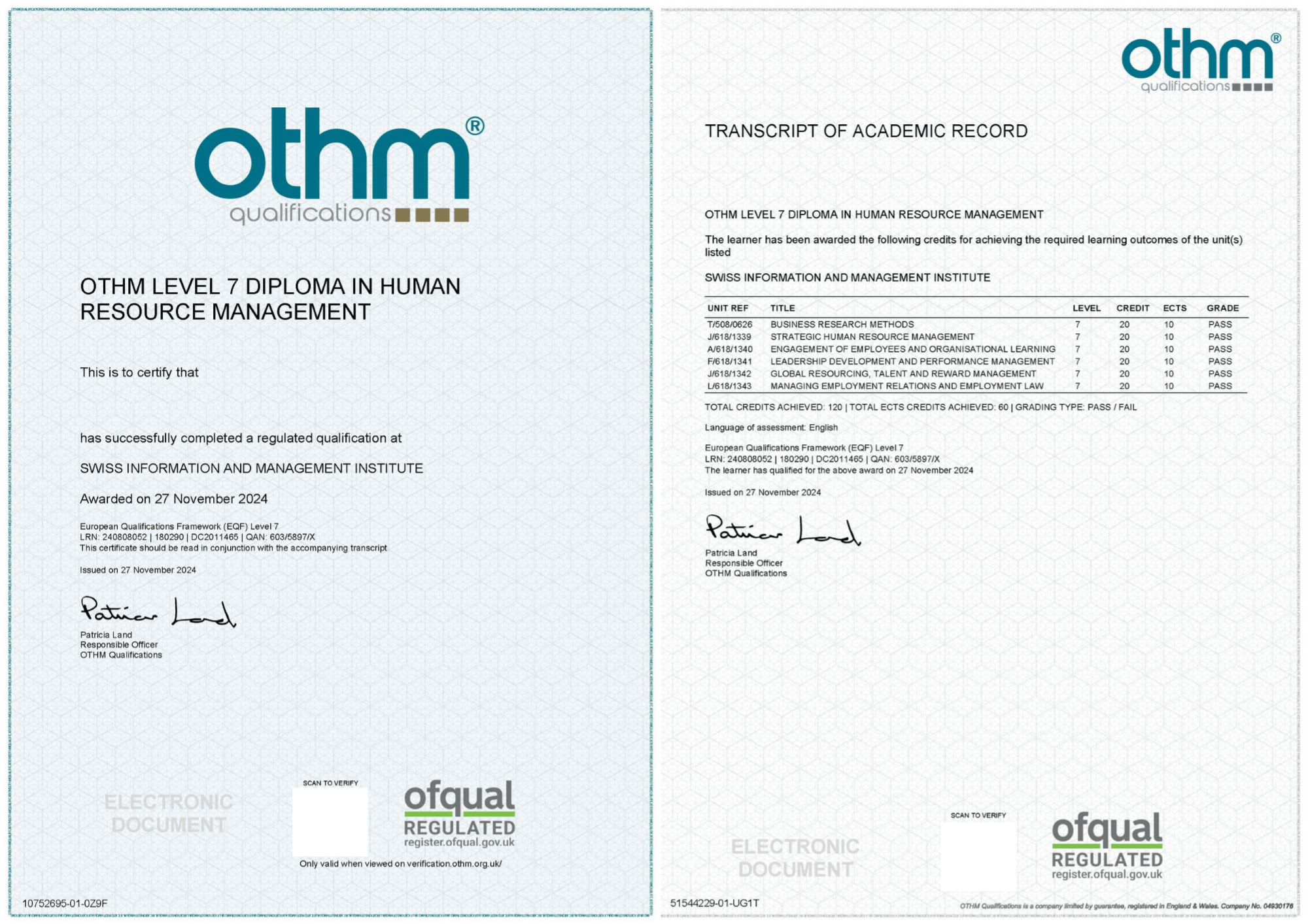 - Văn bằng OTHM Level 7 Diploma in Human Resource Management được công nhận cấp độ Thạc sĩ quốc gia Anh Quốc (Master Level) với mã kiểm định và công nhận Ofqual UK.Gov 603/5897/X. Tham khảo thông tin công nhận TẠI ĐÂY.